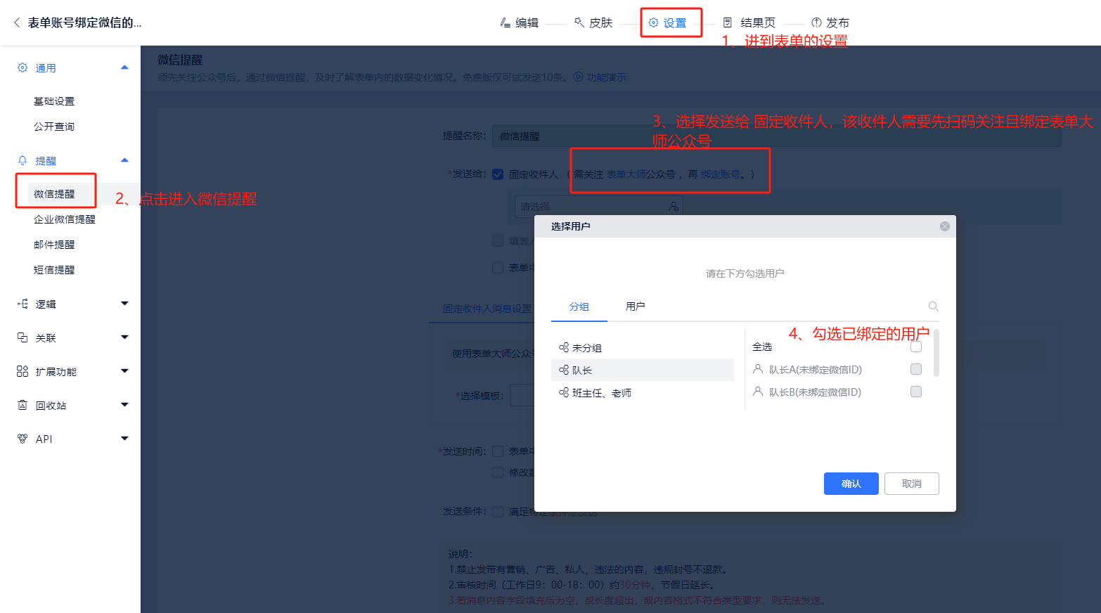 第三步:回到电脑登录表单大师后台,进入设置页面设置微信提醒,选择该绑定过微信号的账号即可。