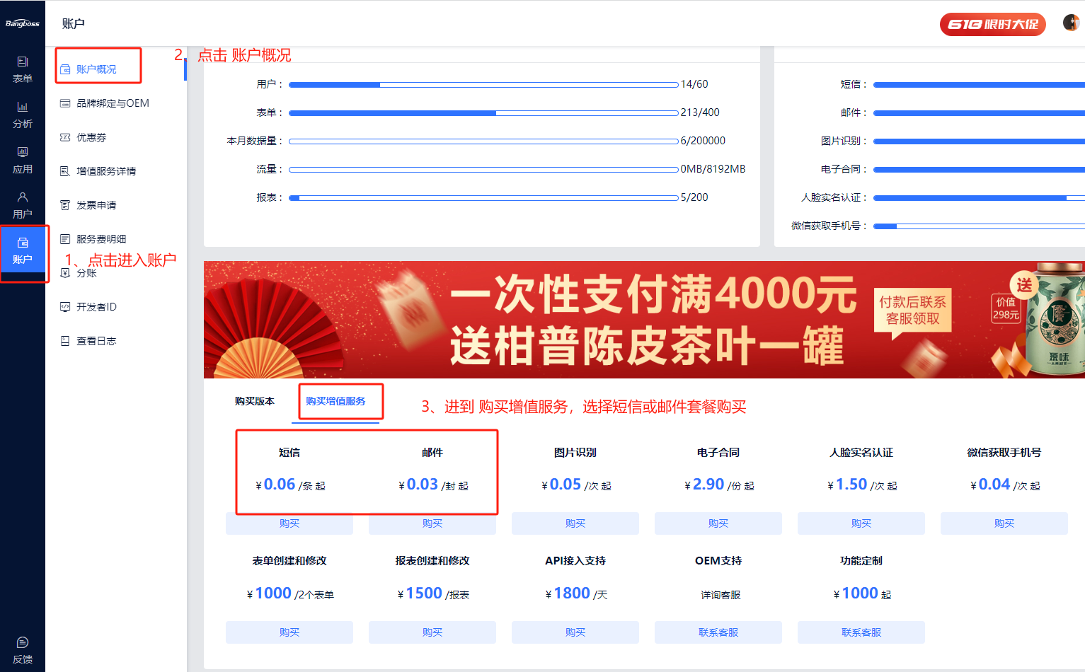 短信、邮件提醒费用不包含在表单大师版本之内,若需给管理员或填表人发送短信验证码、短信提醒、邮件提醒;需要先在账户栏最下方购买短信或者邮件。