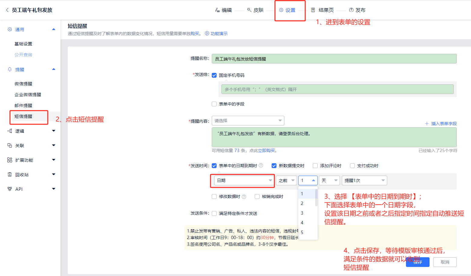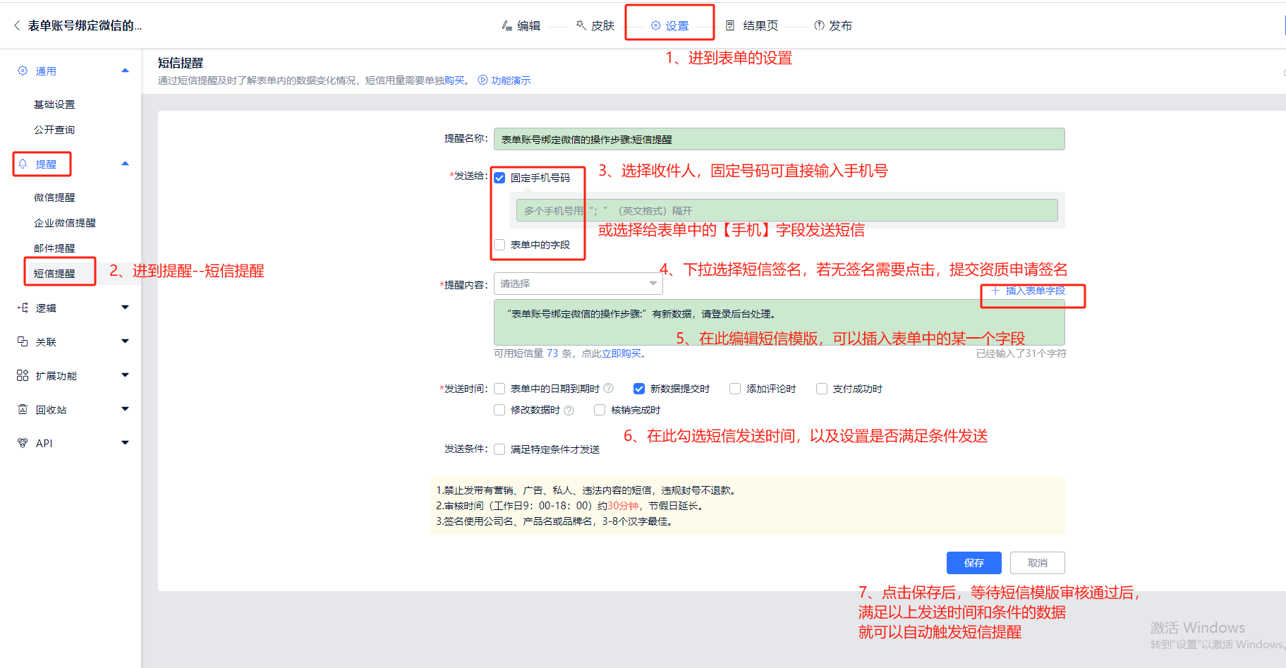 在表单设置页面点击提醒-短信提醒进行设置,具体设置步骤请点击设置教程