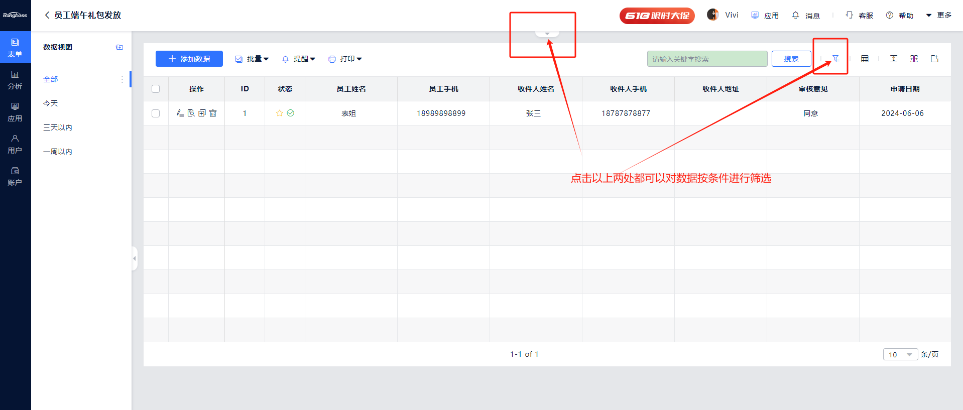 1、以短信提醒为例,点击表单名称,进到表单数据视图,点击筛选按钮,设置筛选条件;