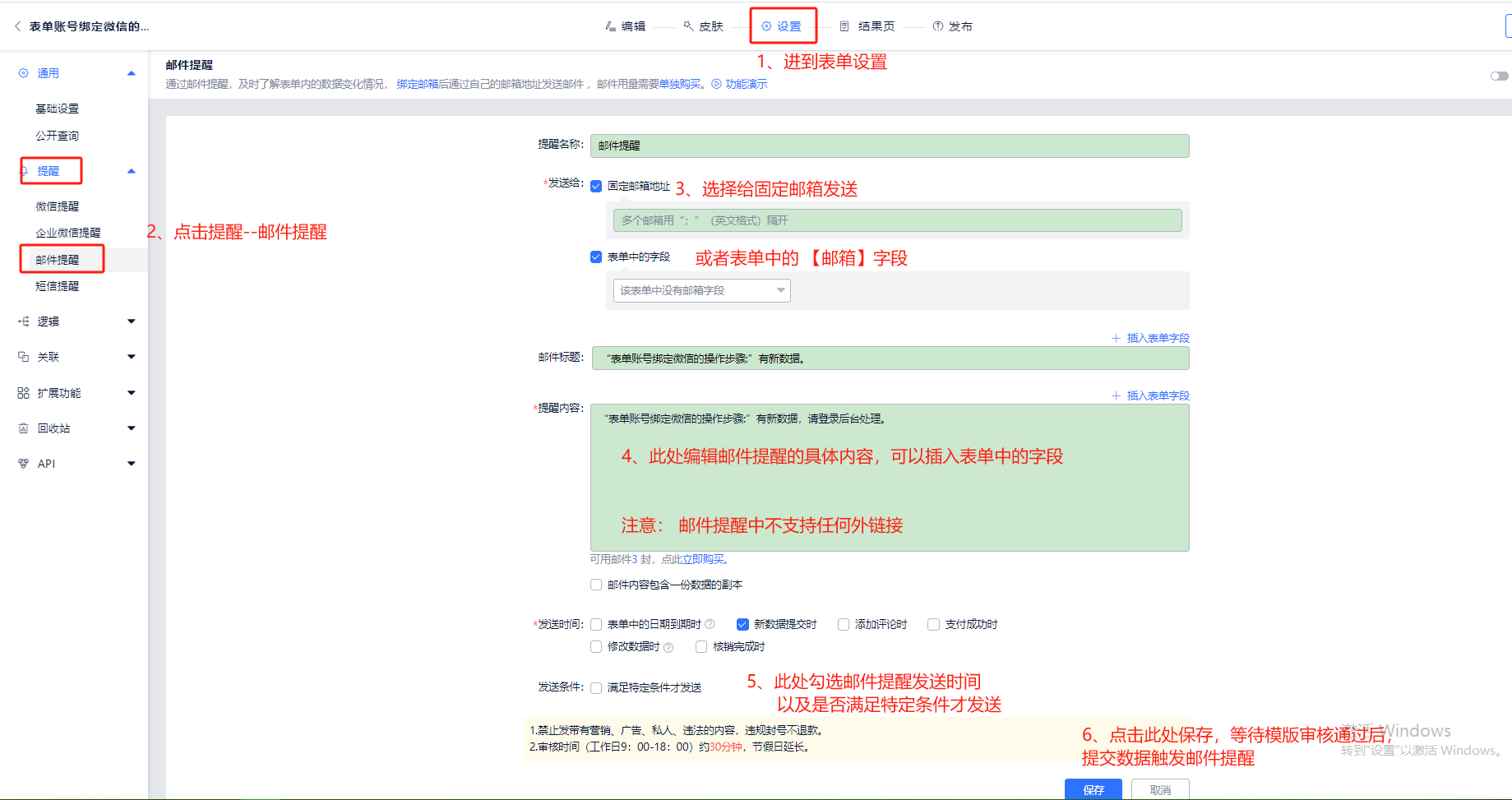 在表单设置页面点击提醒-邮件提醒进行设置,具体设置步骤请点击设置教程