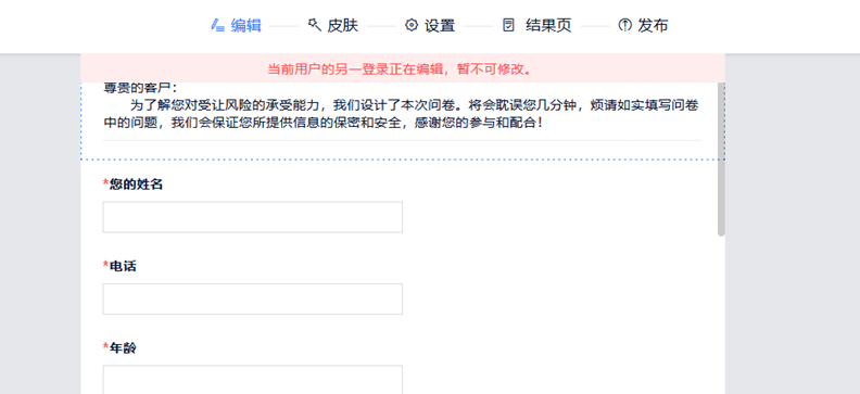 这是系统限制,同个表单的编辑页面不能多个用户同时打开,防止多人操作造成表单结构紊乱,可以退出其他账号只保留一个账号进行编辑,有部分浏览器会有其他账号退出后仍不能编辑的情况,就请联系客服或客户经理帮您解决。