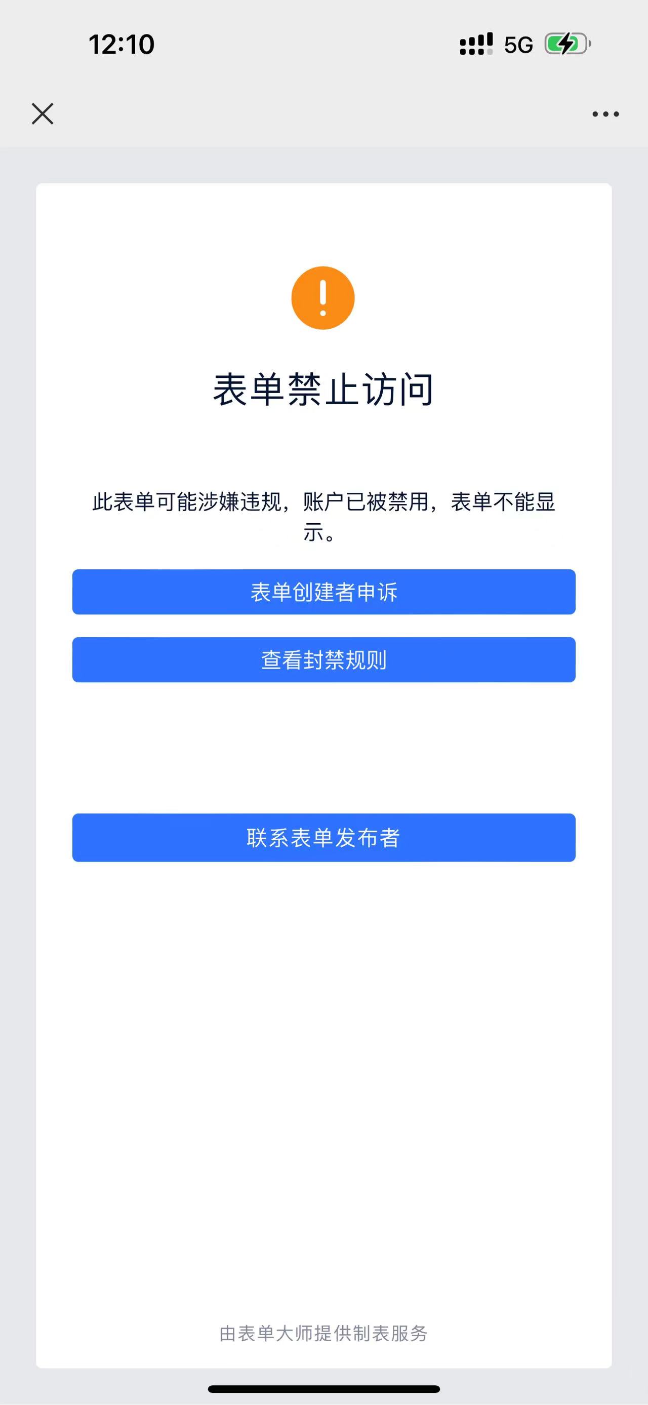 表单或账号被禁用,可以点击“表单创建者申诉”按钮,在申诉表单中说明具体的业务内容,并提交相关资质证明材料,等待审核结果通知。