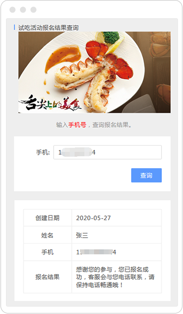 用表单做在线预约报名时,除了可以通过发送短信或邮件进行报名结果通知外,还可以通过「公开查询」实现免费的在线查询。