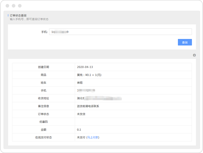 这样,有新订单进入后,商家登录账户后台修改数据,添加订单的发货状态、快递信息。顾客点击查询地址,就能随时查看订单进度了。
