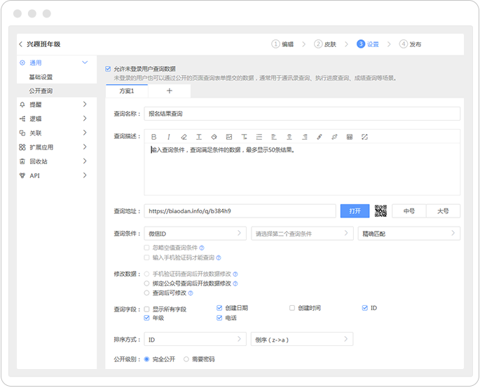查询页面可以设置公开级别「完全公开」或「需要密码」,设置查询密码后没有密码无法进入查询页面。