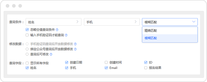 可以添加多个查询条件,自定义条件之间的「且」「或」关系。例如设置查询条件为「姓名+手机号」、「会员号或手机」,选择精确匹配则两个条件都匹配时才显示查询结果;选择模糊匹配则一个条件符合,另一个条件只输入一部分内容即可(适用于数据不确定的时候模糊查询);勾选忽略空值查询条件则两个条件只需输入一个正确,另一个为空时也可以快速查询结果。