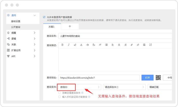点击表单设置-公开查询,勾选「允许未登录用户查询数据」,即可设置查询方案。
