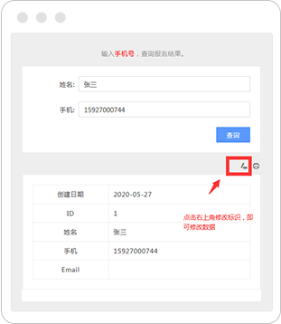 1.通过手机验证码修改数据:当手机号(即电话字段)作为查询条件时,输入手机号后会下发短信验证码,凭验证码查询后修改数据,适用于对数据安全隐私比较高的场景。