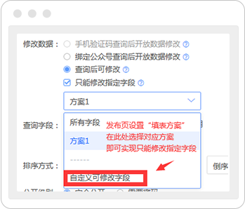 4.修改指定字段:勾选公开查询可修改数据后,还可以设置只能修改指定字段。在表单「发布」页面设置自定义填表方案,然后在此处选择对应的方案名称就可以啦。