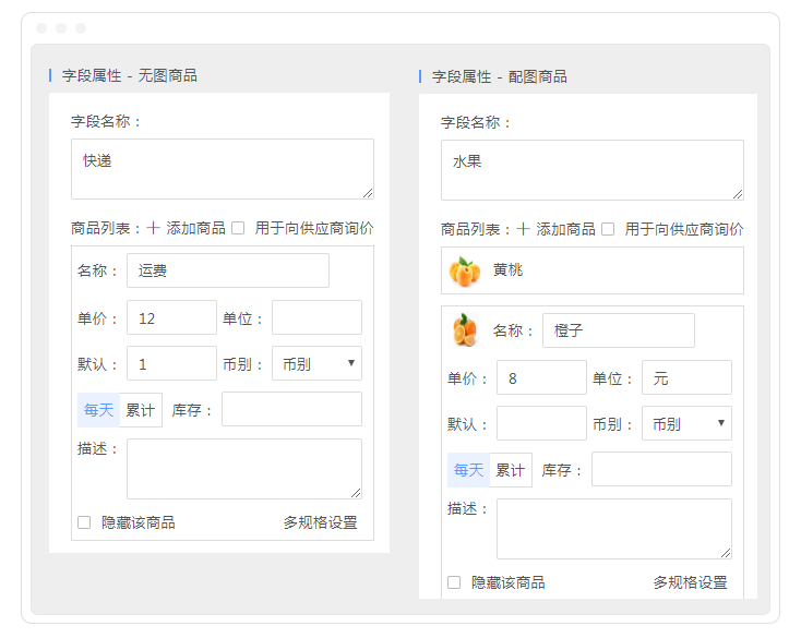 | 商品字段说明 | 表单大师提供两种商品字段组件,配图商品及无图商品;两者区别在于是否可以添加商品图片,无图商品更适合设置运费、服务费等场景。 |