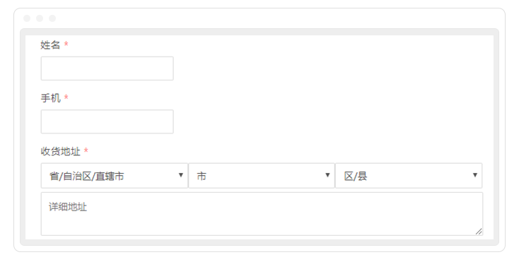 除了商品信息展示外,购买人的收货信息也是一个重要组成部分。表单大师同样提供丰富的联系信息字段,可以用来收集收货人的姓名、手机、收货地址等信息。