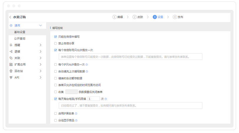 进入表单“设置-通用设置-基础设置”,可以设置比如同一设备只能提交一次,或者勾选“只能在微信填写”+“每个微信账号只允许提交一次”,更好的进行限制。