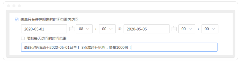 进行表单通用设置时,还可以设置表单访问起止时间范围,实现限时抢购的效果。再搭配商品字段的每日库存功能,就可以进一步实现限时限量抢购啦。
