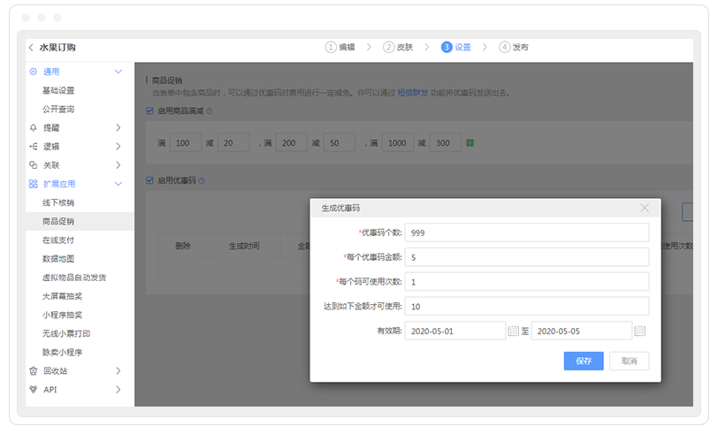 简单的在线商城不够有吸引力?如何加强客户之间的互动,刺激消费呢?不妨试试商品促销功能,表单“设置-扩展应用”页面,开启商品促销,比如“启用商品满减”或者“启用优惠码”功能,给老会员发一波限时优惠码,都是不错的刺激手段呢~