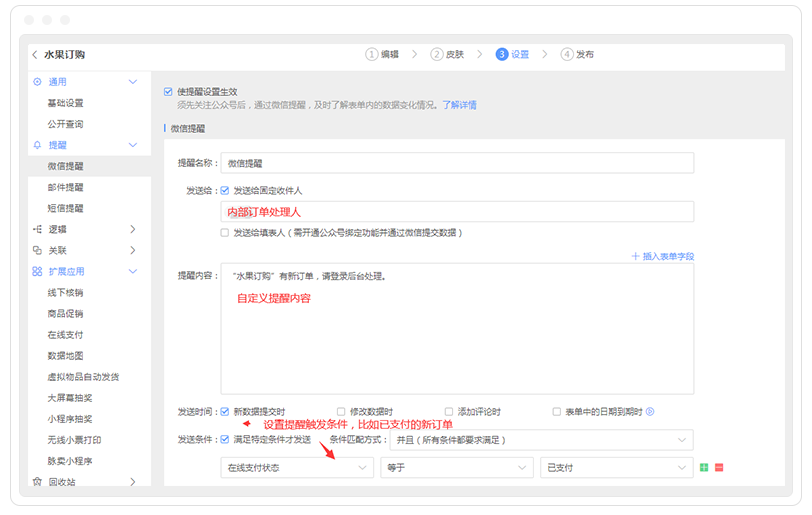 客户提交订单后,相应的订单号、支付方式、支付状态,选购的商品明细都可以通过提醒功能进行及时提醒反馈。表单大师提供多种提醒方式,微信/短信/邮件都可以进行订单信息的提醒,方便店家及时跟进处理订单。