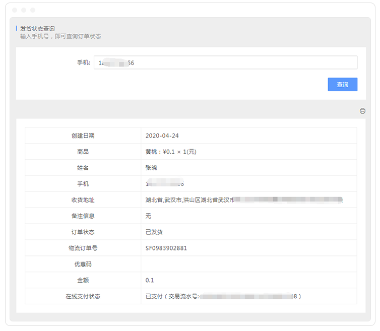 表单大师虽然不能帮你实现发货,但是发货状态、物流单号、售后评价等等需求你都可以通过表单功能去灵活配置。比如在售后环节进行交易物流信息同步,然后通过表单公开查询功能,满足客户自助查询订单状态等场景,实现服务闭环。