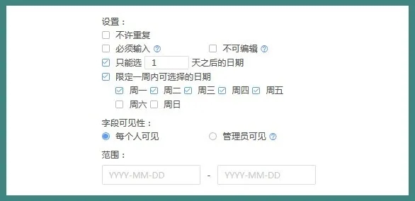 通过「日期」字段,你可以灵活的限制预约的时间范围,比如只能工作日预约,只能预约1天之后的日期。甚至你还可以通过「电话」字段、「单选」字段实现更个性化的场景,比如每个手机号只能预约1次…