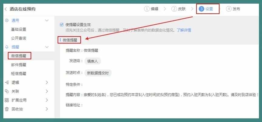 制作好在线预约表单后,还可以通过表单设置「提醒」功能实现多样化的需求,比如短信提醒(预约状态告知)、微信提醒(支付状态提醒)、新数据提交提醒(新订单提醒)等等,及时掌握预约情况。