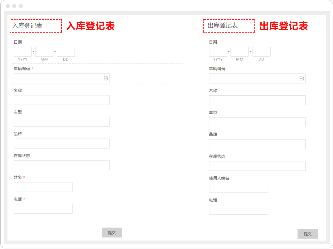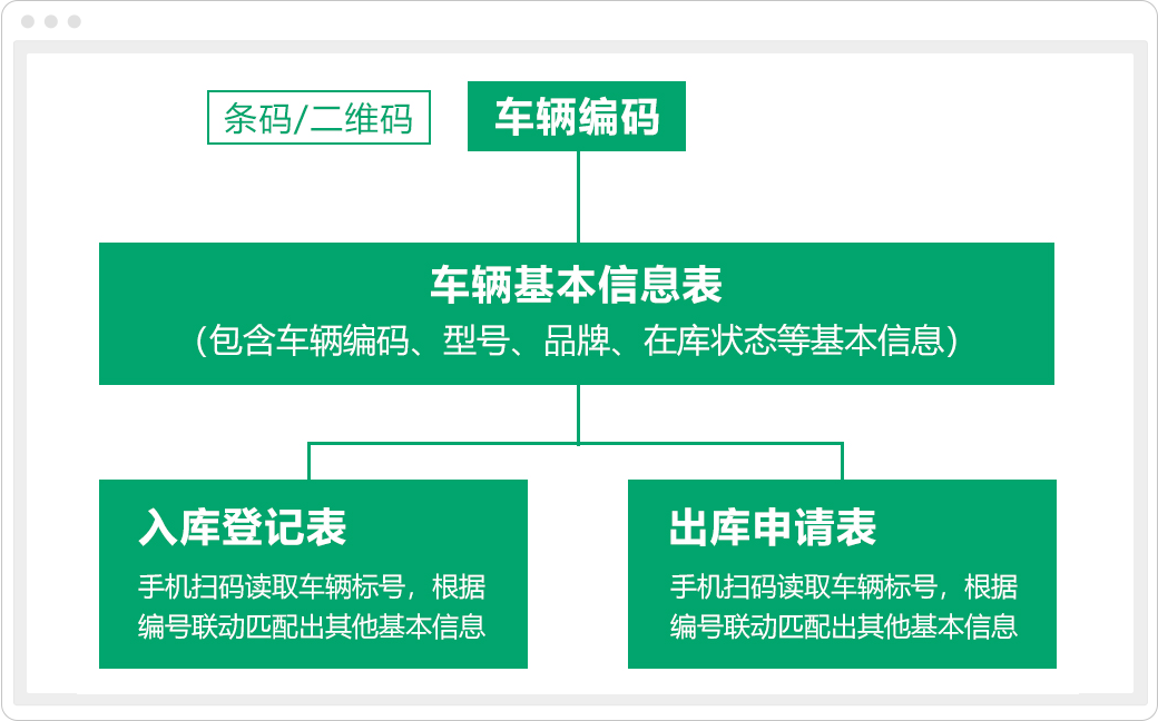 通过扫码输入功能,在进行车辆入库/出库表填报时,扫描车辆编码,联动匹配出车辆基础信息表内的车辆基本信息,然后提交入库/出库表,再通过关联更新功能,更新车辆实时在库状态。