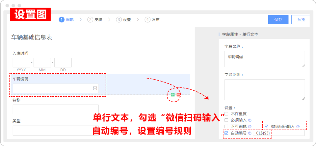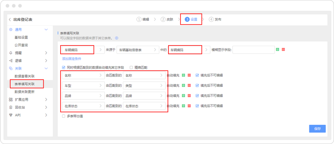 设置「车辆编码」勾选扫码输入,然后以该车辆编码作为联动条件,设置数据联动。