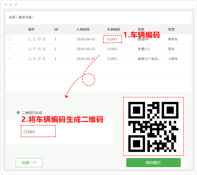 2.通过二维码生成工具,将「车辆编码」批量生成二维码图片,并打印下来贴在车辆上。