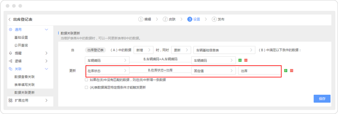 5.提交出/入库登记表,同样以「车辆编码」作为更新联动条件,实现「车辆基础信息表」中车辆状态的实时更新,即可通过报表实时掌握最新状态。