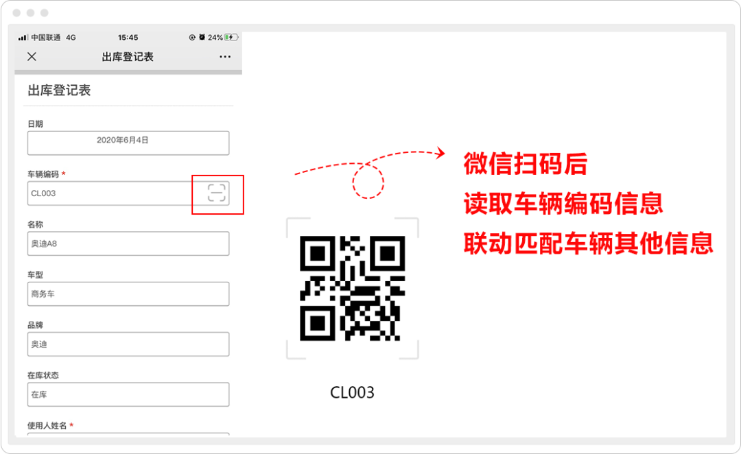 4.手机微信端访问「入库表」/「出库表」,车辆编码字段右边有一个扫码标识,扫描对应的二维码,读取编码信息,同时车辆其他基本信息也会联动匹配出来。