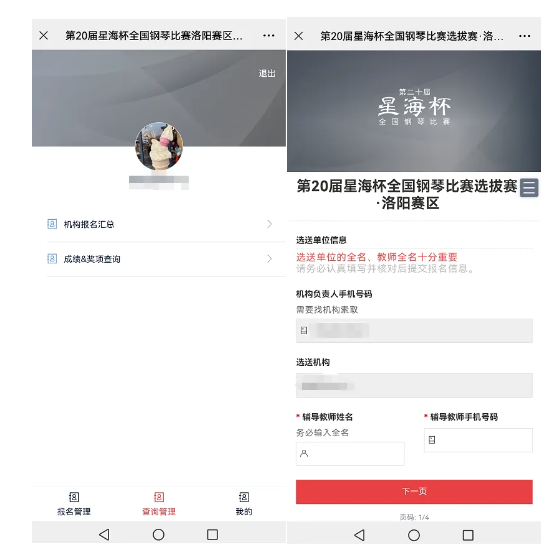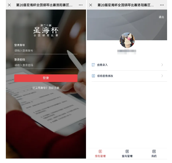 【星海钢琴文化艺术馆】每年会有不同赛事种类的钢琴比赛,涉及全国多个赛区。机构缺乏一个规范简洁的操作平台,供赛事举办方作为信息登记的入口,以及家长、学员报名和查询成绩的入口。