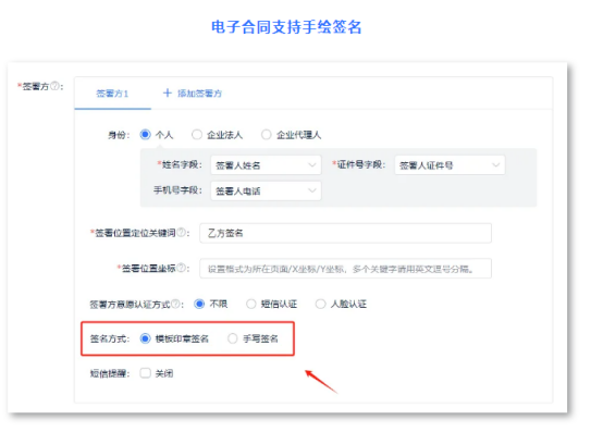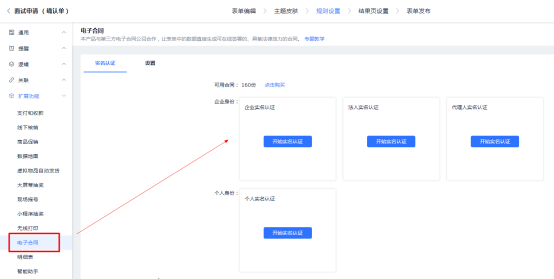 在后台,设置电子合同,进行合同发起方的实名认证,实名认证后即可上传合同模板,对电子合同进行详细的设置。