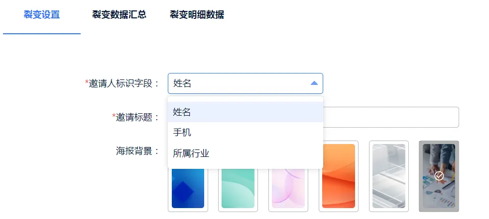 1、设置“邀请人标识字段”,如姓名,也可以是手机号、公司部门,岗位,员工公号,以便做数据统计时,清楚裂变来源。
