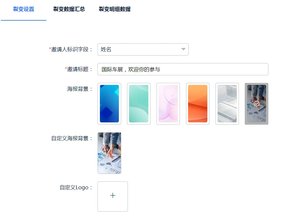 2、输入“邀请标题”,作为引导语,并在下方选择合适的海报背景,也可自定义上传图片,起到宣传作用。同时,海报上可自定义上传品牌、活动logo,增加品牌效应。