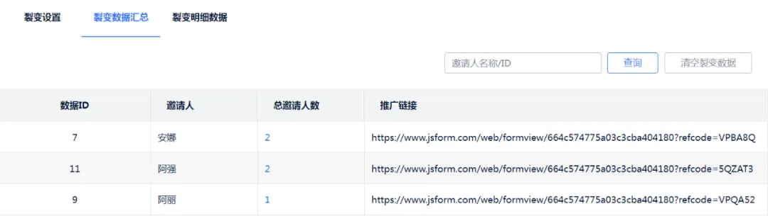 有意向的用户通过链接或二维码,进行填写,便能实现表单有效裂变。此时,每一个填表人裂变产生的数据将汇总于此,其中包括数据ID、邀请人、总邀请人数以及相关推广链接。