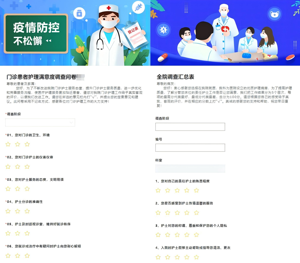 1、针对不同科室,利用表单大师为各个科室创建专属的“满意度调查问卷”,用来记录患者就医后的真实感受与反馈,并打出相关分值。