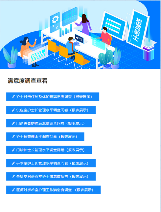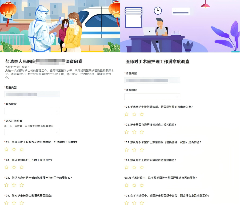 行政部门需要每个季度对各个科室的工作做满意度调查打分,对工作中做得不满意的地方进行改进和分析,并且形成图表,作为每个季度的测评展示。另外,医院需要日常统计会议的签到、签出情况以及医院教学教评等情况。