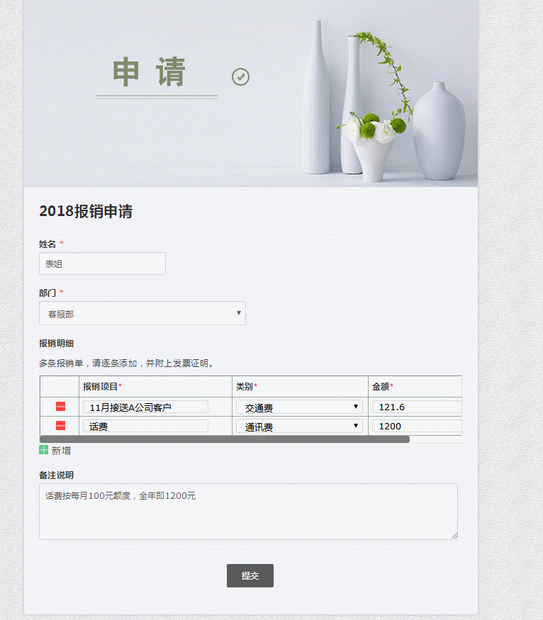 临近年底,报账人数多,工作业务量大,虽然通过表单大师做了一个在线报销申请表, 但是遇到一个人有多条报销记录要提交时,用现有的表单就只能重复提交,有没有更便捷的方式,申请人可以一次性录入多条报销记录,这样更省时,财务在进行核对时也更直观。