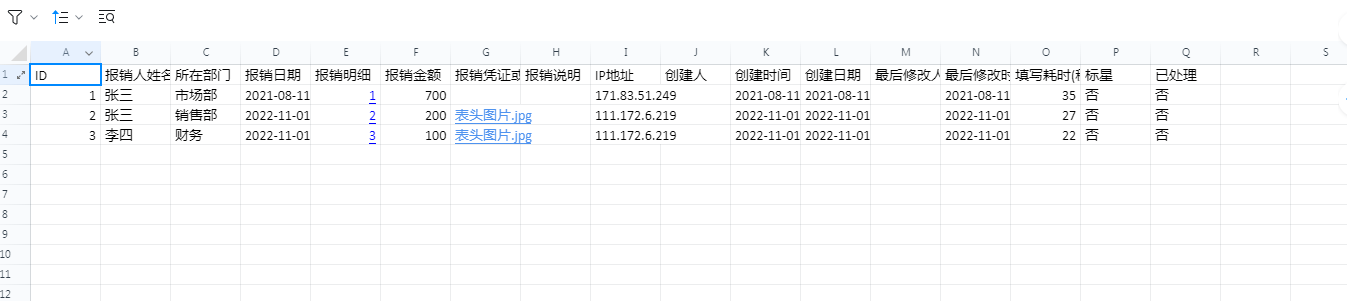 当申请人一次性提交多条报销记录后,进入数据后台,点击查看数据,可以清晰看到他的多条报销记录都在同一条数据内,导出到Excel中也是如此。