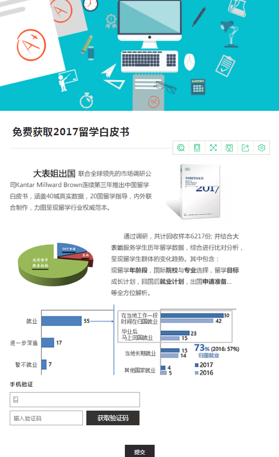 比如,某著名培训机构用表单大师制作了一个“免费获取2017留学白皮书”表单,吸引留学生关注,获得手机等联系信息,以便后续追踪。