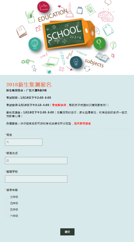 再比如,某寒假培训班举办了一个新生集测活动,即通过集体考试的方式帮助报名参加活动的学生梳理知识,考完后还会进行讲评,同时组织家长交流会,以此做了一个集测报名表吸引家长报名参加。