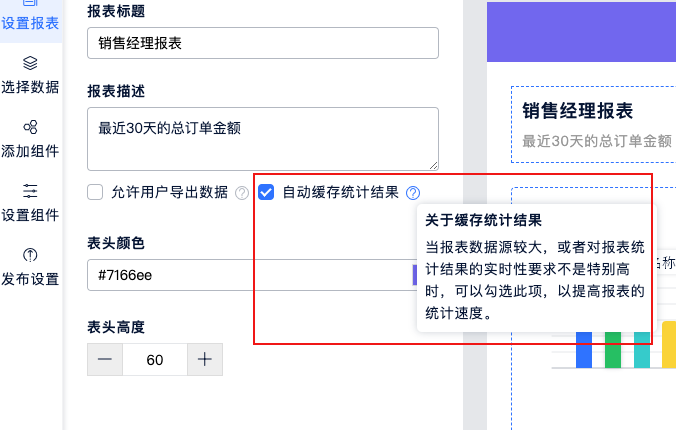 简单设置报表的名称、描述、表头颜色、表头高度。