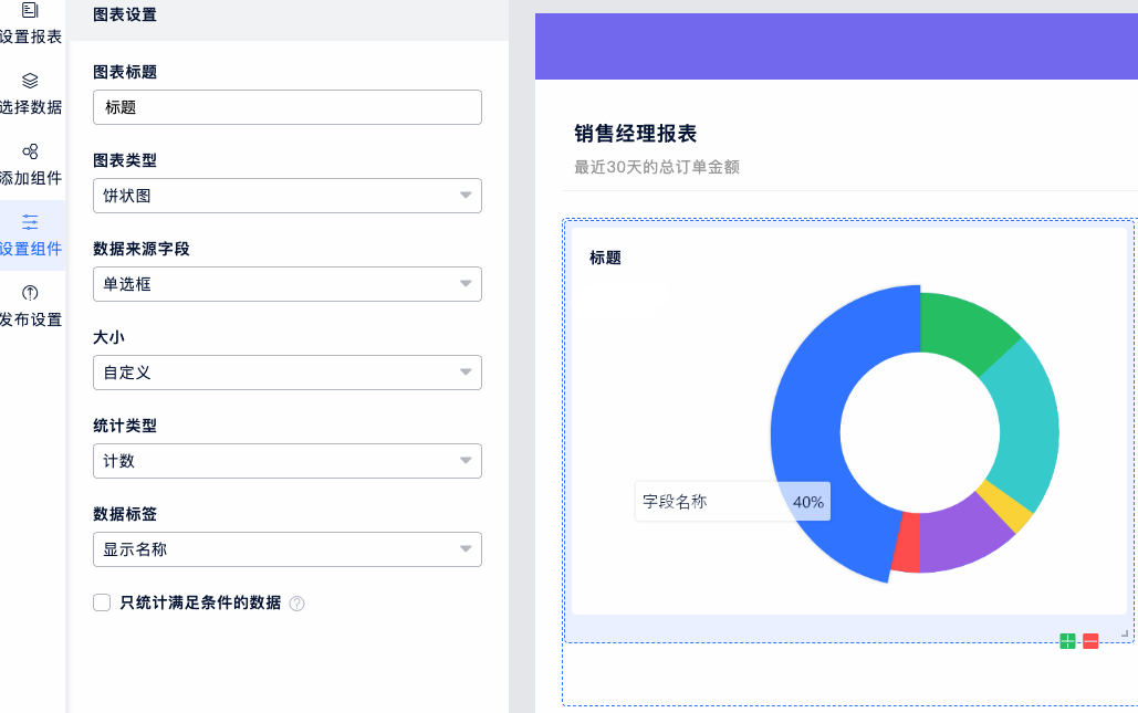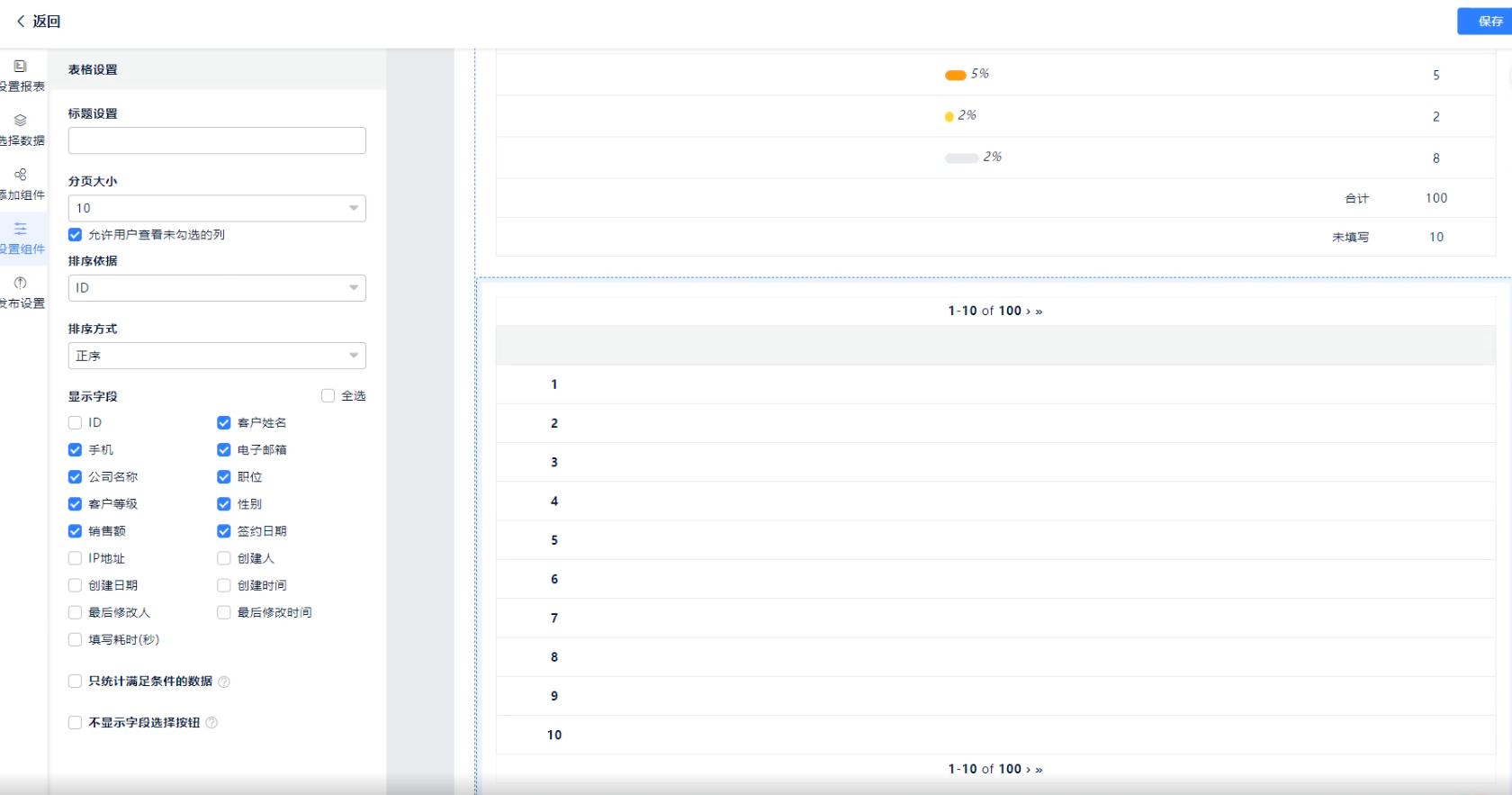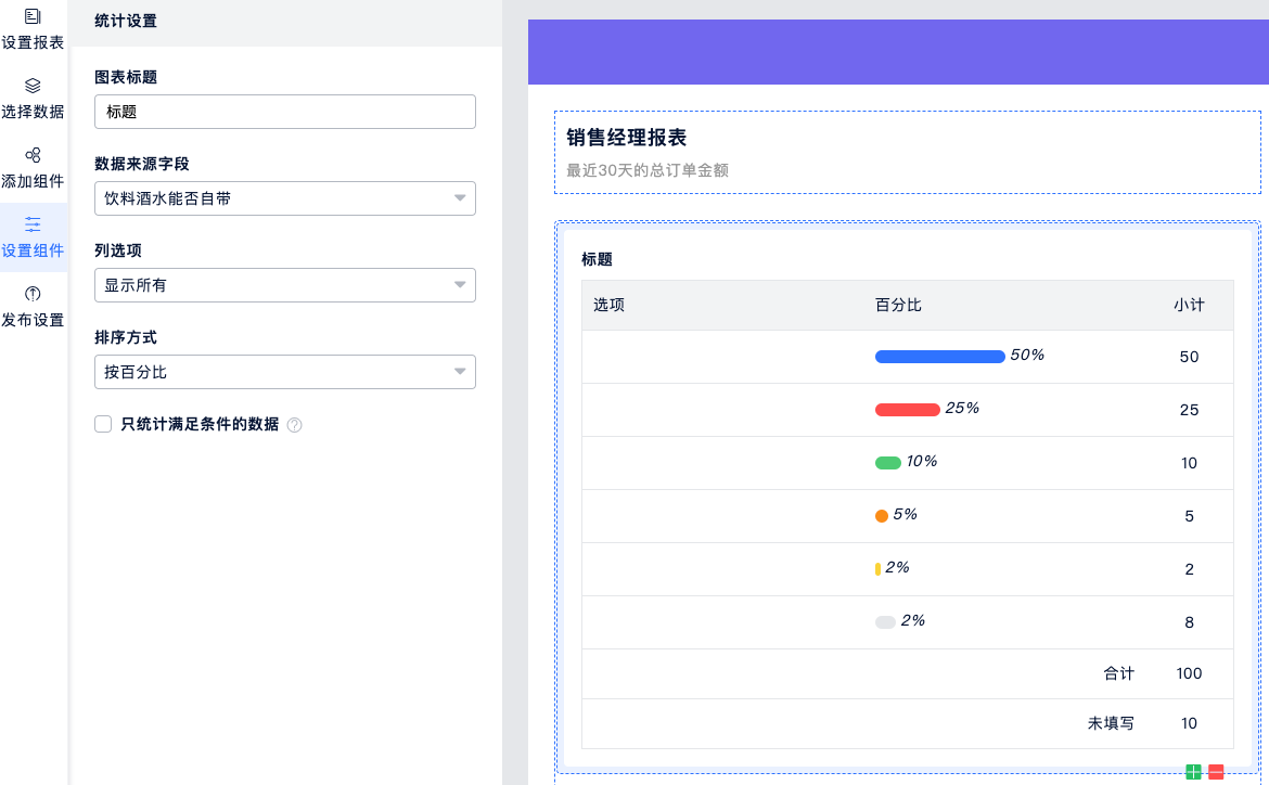 与柱状图类似,一般选用单选或下拉字等枚举类型的字段作为数据来源字段,统计每一项被填写的次数以及所占百分比。还可以显示更详细的百分比、计数和未填写数量。