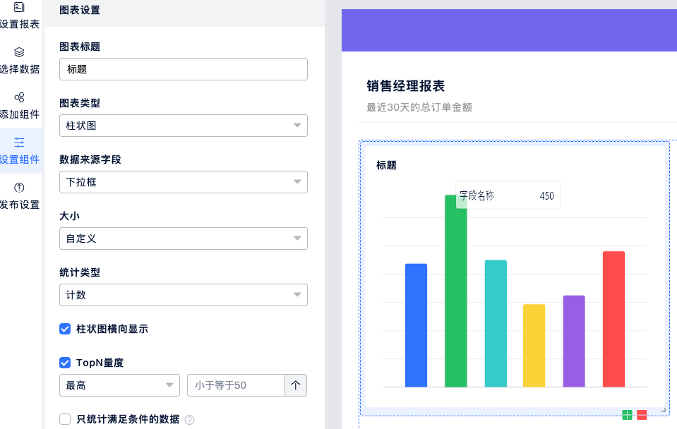 与饼状图类似,只是表现形式不一样。横轴表示数据的分类,纵轴表示每一分类的数量。一般也是选用单选或下拉字等枚举类型的字段作为数据来源字段。与饼状图不同的是,柱状图还可以显示 TopN。