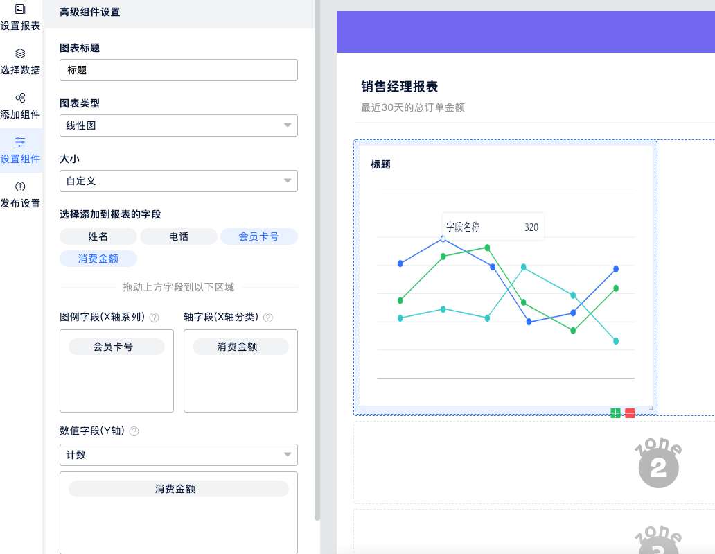 除了一条一条对数据进行查看和处理,还可以通过图形化报表的方式,更直观的展示数据。同表单一样,报表分析也采用了拖拉拽可视化的操作方式,与Excel透视图类似,小白也能上手。