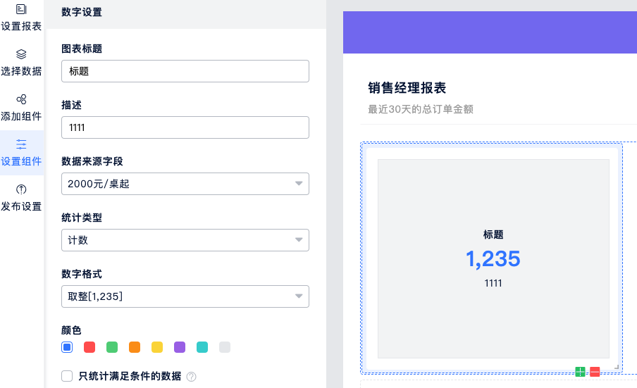 以粗体的方式显示统计的数据。可以设置数字的颜色和数字格式。如果数据来源为数字类型,则统计类型可以是计数、求和、平均值还是最大值和最小值,否则默认为计数。