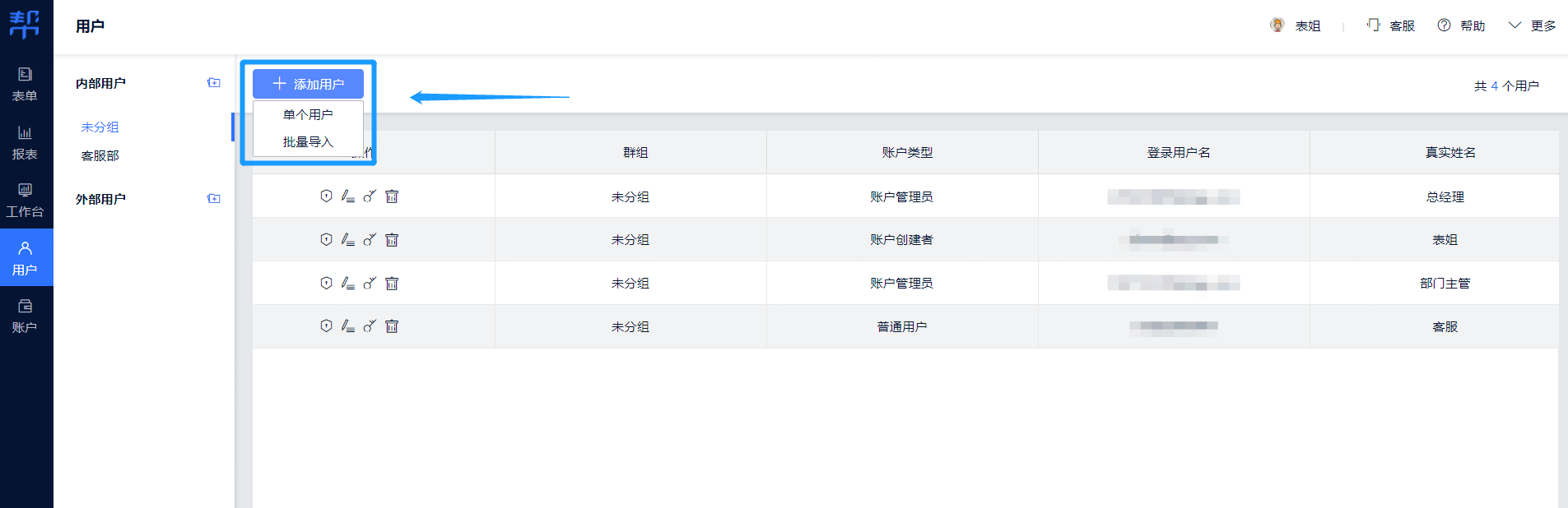 对于一些企业而言,表单不仅仅只是作为个人使用,当你需要多人同时协助管理表单,可以点击页面右上角的“添加用户”添加新用户共同管理表单。成功将用户添加到账户内后,对用户进行设置权限、修改用户信息、修改密码、删除用户这些操作。