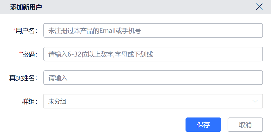 添加单个用户,则会弹出如下页面,填写用户基础信息,逐个添加新用户即可。