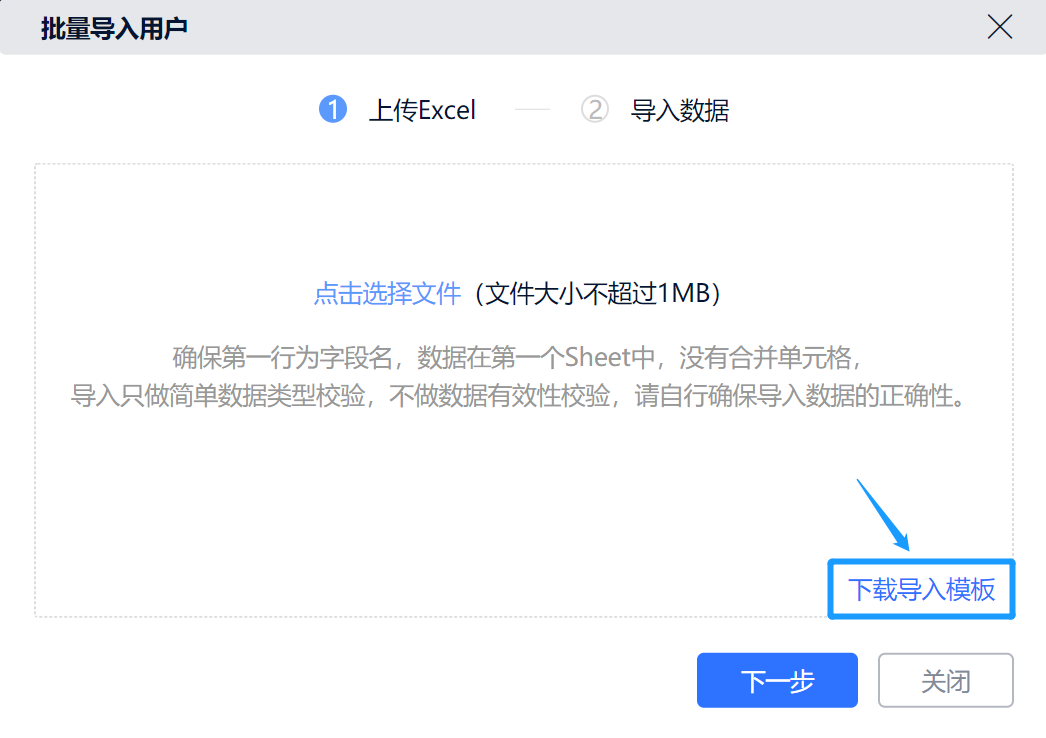 指通过Excel进行批量导入,选择页面右下角的“下载导入模板”下载到本地,在Excel模板中填写需要导入用户的信息,最后点击上传即可批量导入用户。