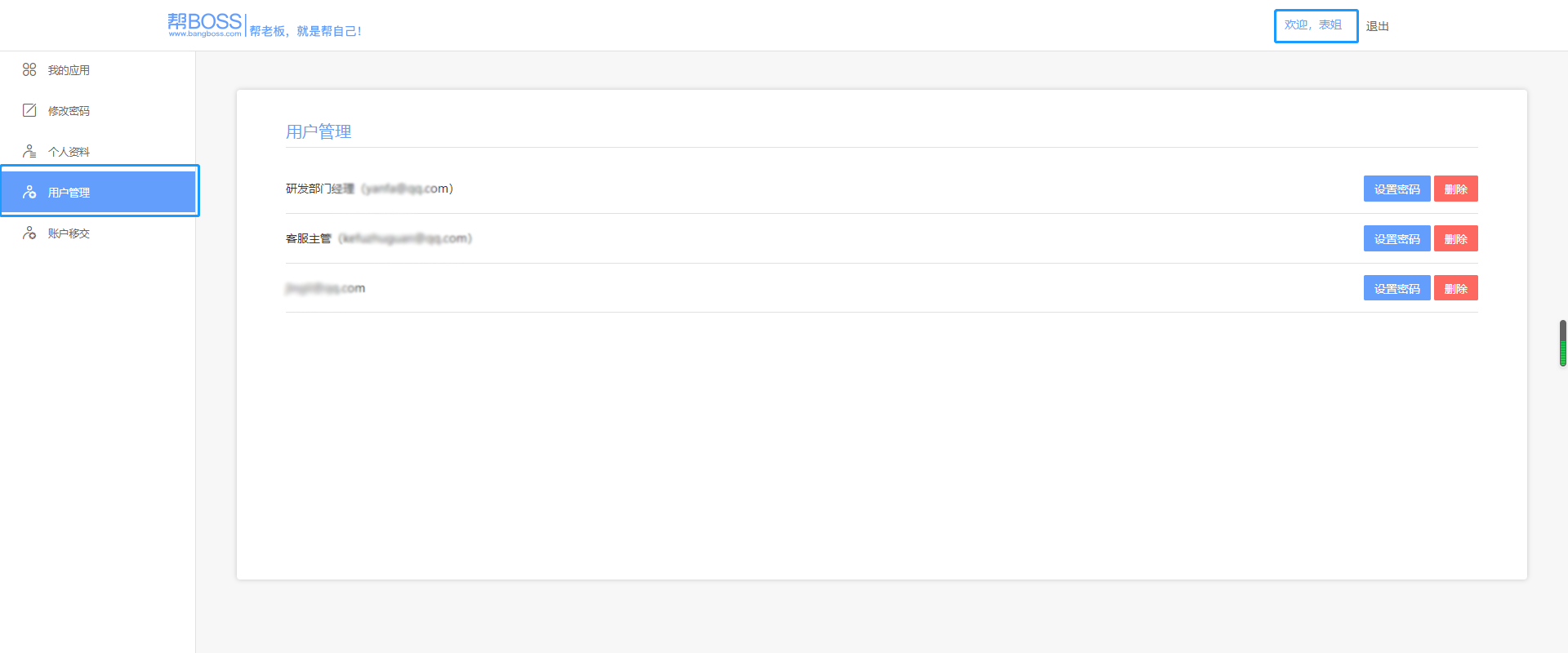 点击页面右上角的账户登录名进入到后台管理系统,选择用户管理可以对添加的用户进行删除,在系统后台页面删除了用户,即彻底删除了该用户,需注册Bangboss账号才能重新使用旗下产品,注意谨慎操作哦。
