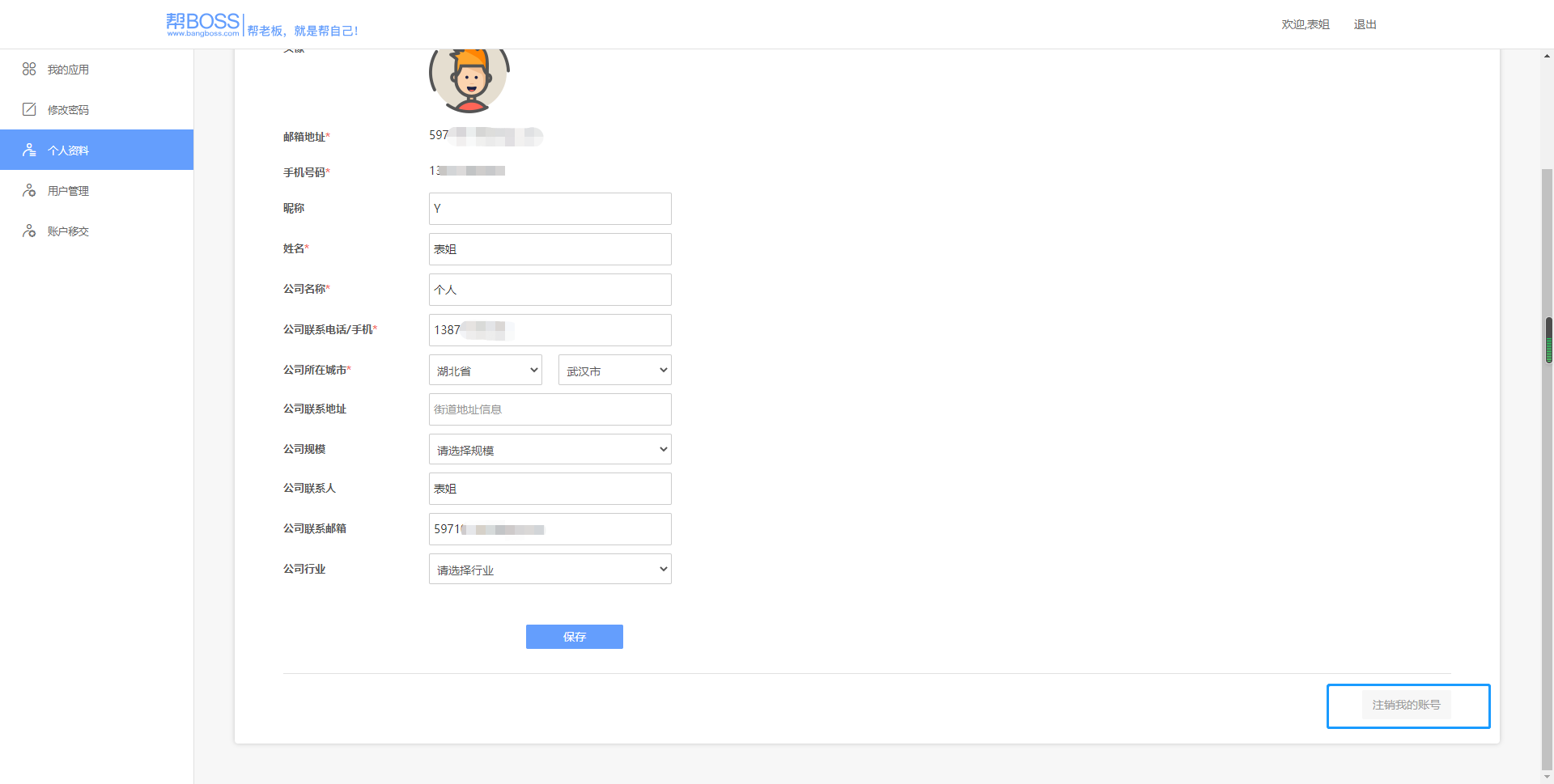 还是在后台管理系统中,个人资料页面不仅可以修改账户的个人资料信息,还可以在页面右下角选择“注销我的账户”,注销之后该账号不能登录Bangboss旗下任何产品,该账号下的所有表单,数据将全部清除。由于该操作不可逆,请一定要注意谨慎操作。