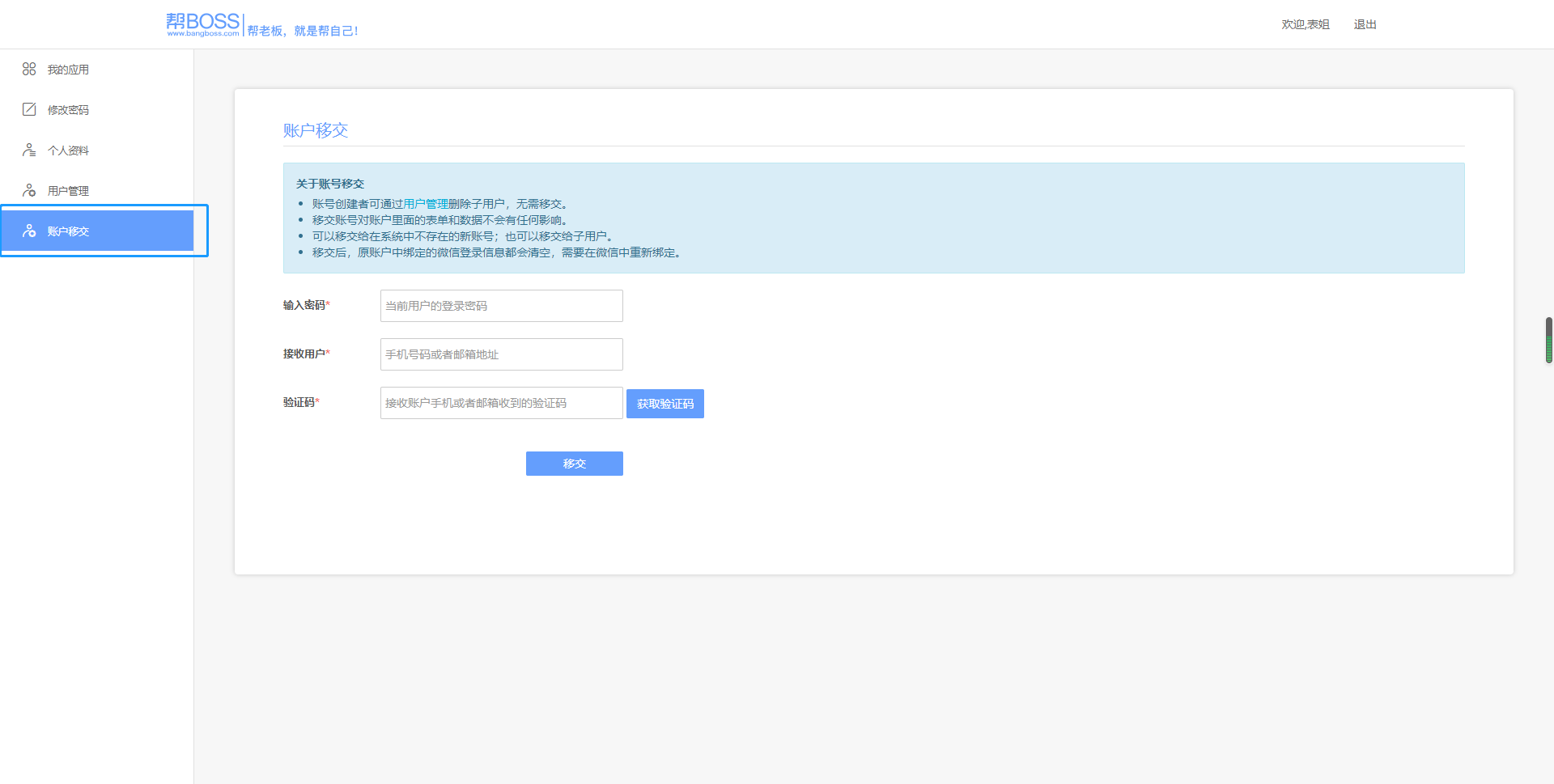 账户移交在用户管理的下方,只需要按照要求填写当前用户的登录密码以及接收用户的手机号码或邮箱地址,最后输入验证码,点击“移交”即可。